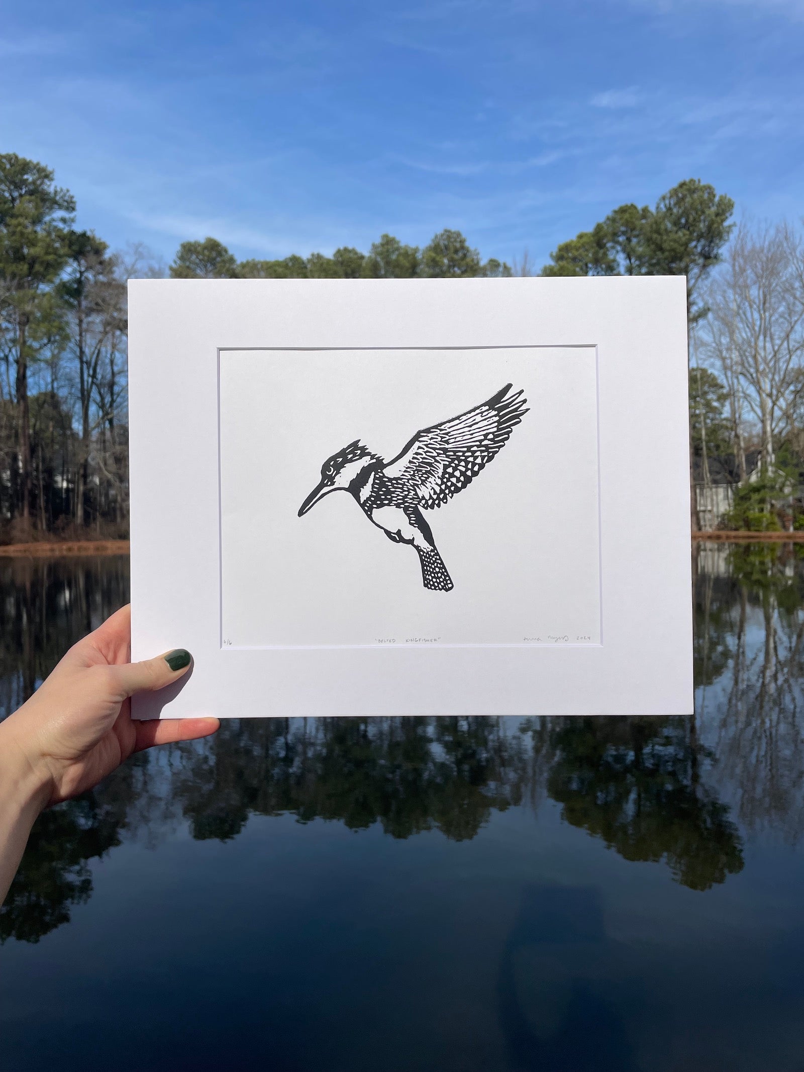 Linoleum Block Print of a hovering belted kingfisher. Hand printed in black ink on white paper with white mat. Mat measures 11" x 14"