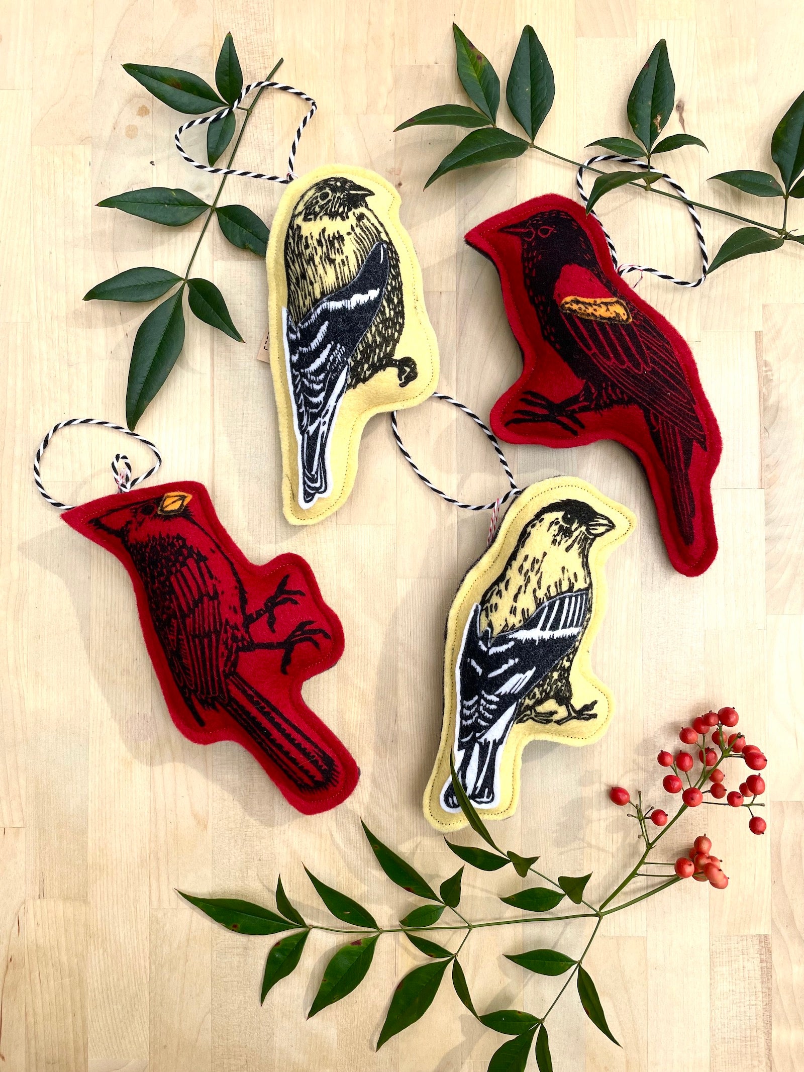 Hand printed Christmas ornament. Image is printed on 100% wool felt using a hand carved linoleum block. Black and white cotton twine for hanging. Stuffed with polyester filling.