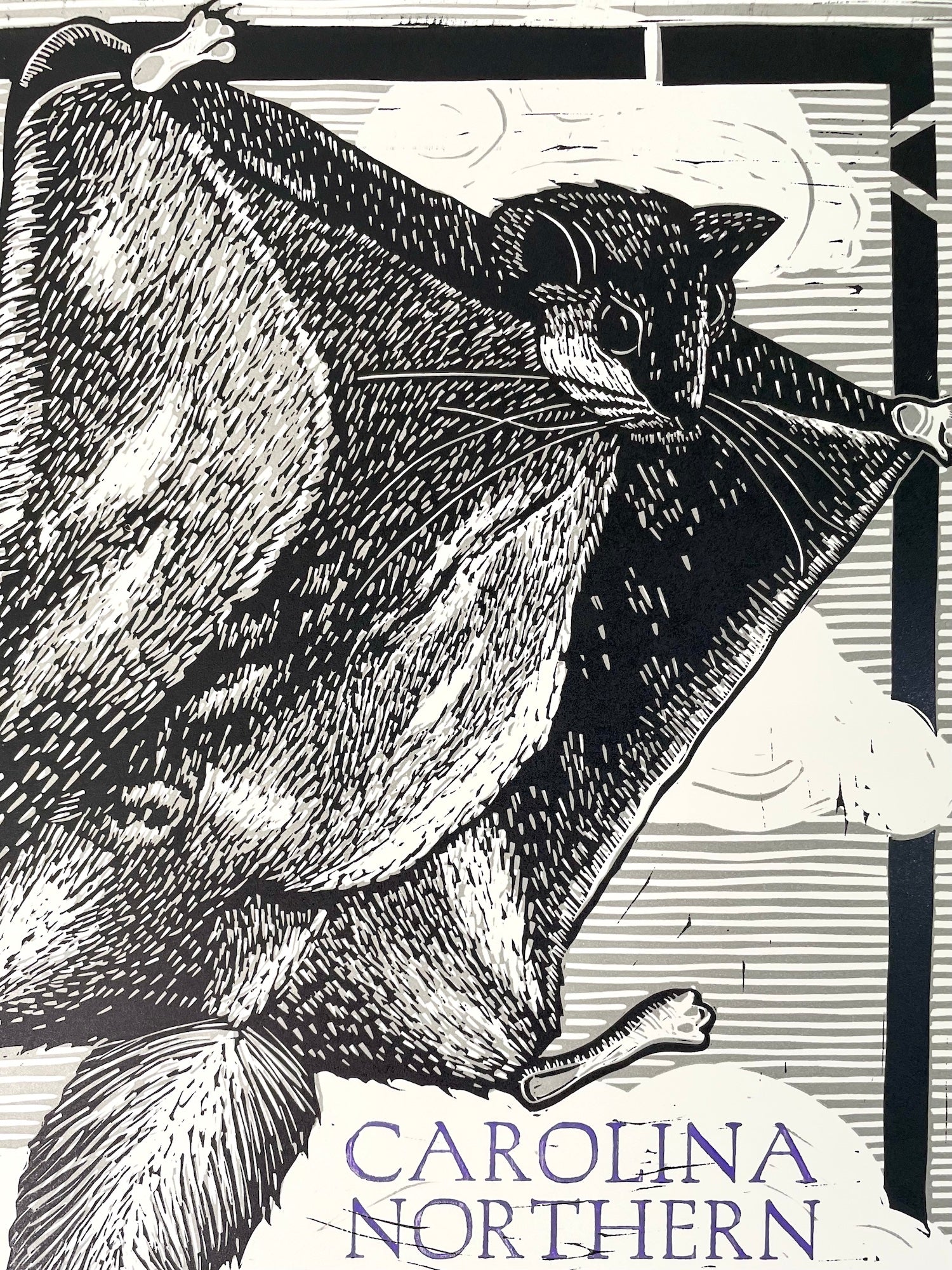 Three color letterpress poster featuring a Carolina Northern Flying Squirrel.