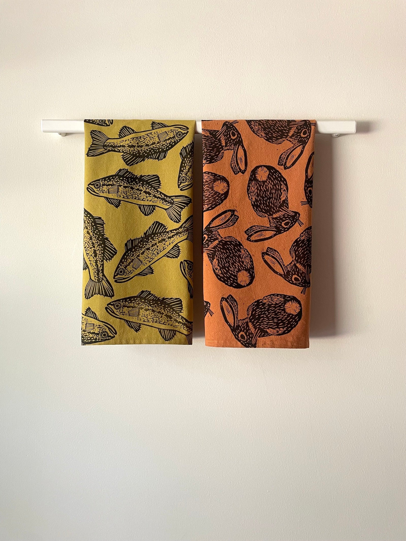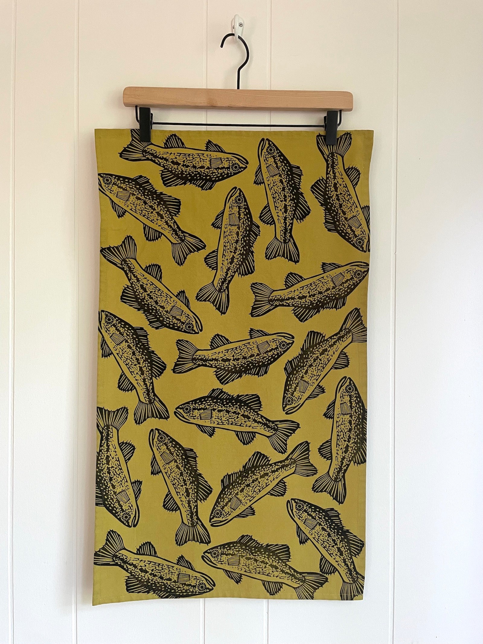 100% cotton tea towel printed with a large mouth bass. This print has been hand drawn and carved from a linoleum block. Each image is hand printed on chartreuse colored crinkle cotton. Each tea towel has a 100% cotton hanger on a back corner. Each tea towel is 100% unique with no two exactly alike. Tea towels may be machine washed on cold cycle. We recommend line drying and using a warm iron as needed. Image may fade over time with heavy use due to the nature of the hand printing process.