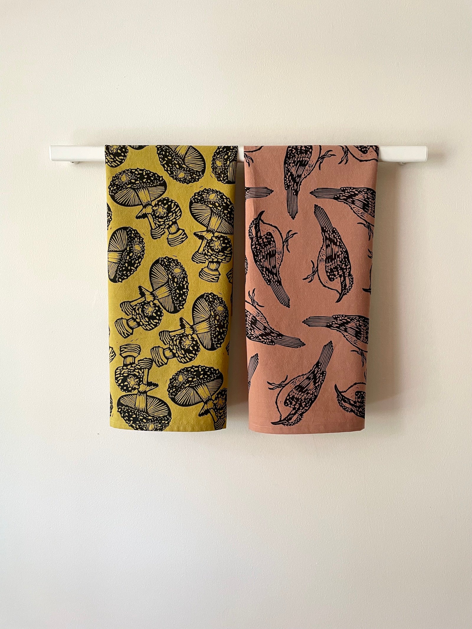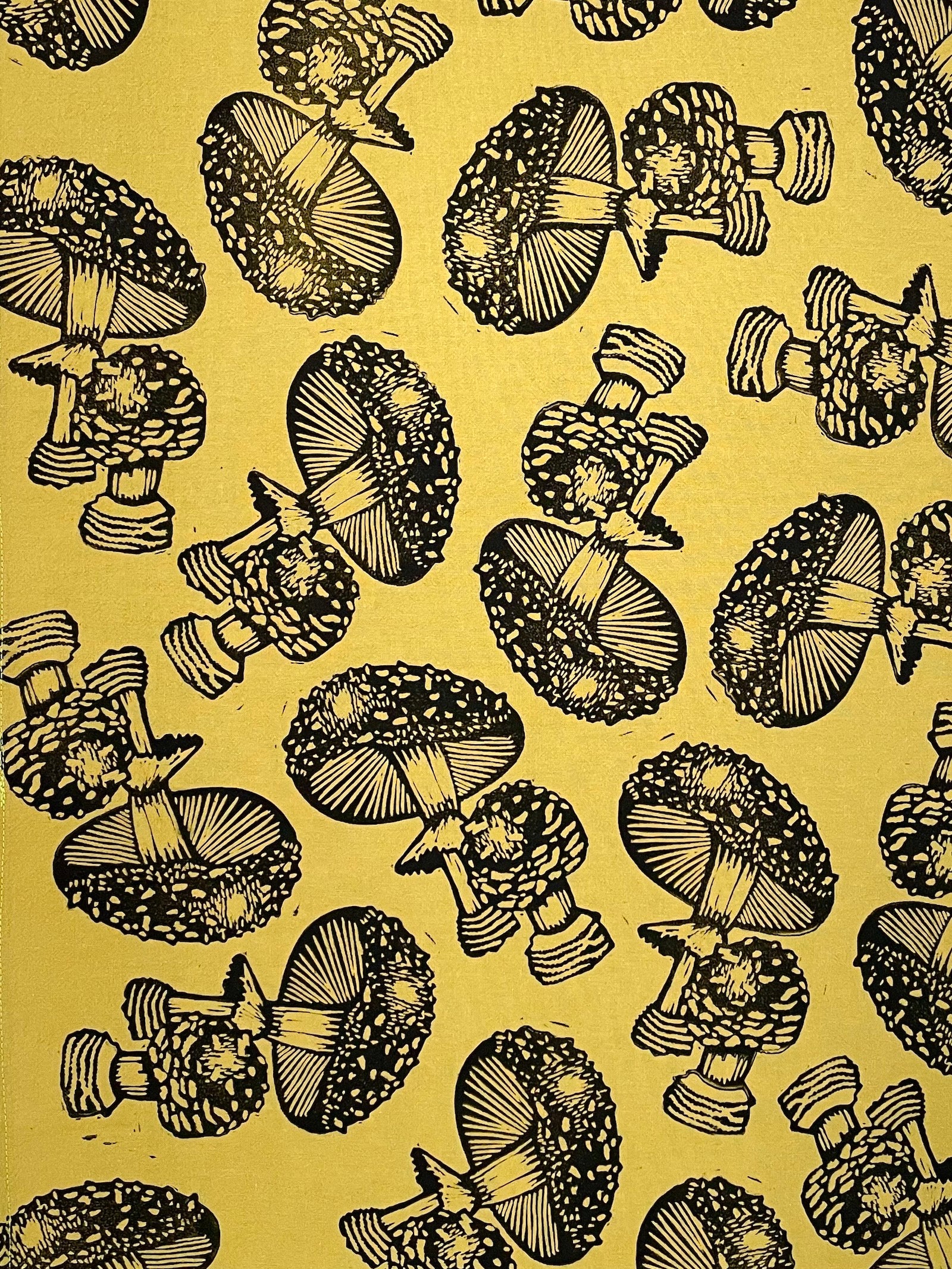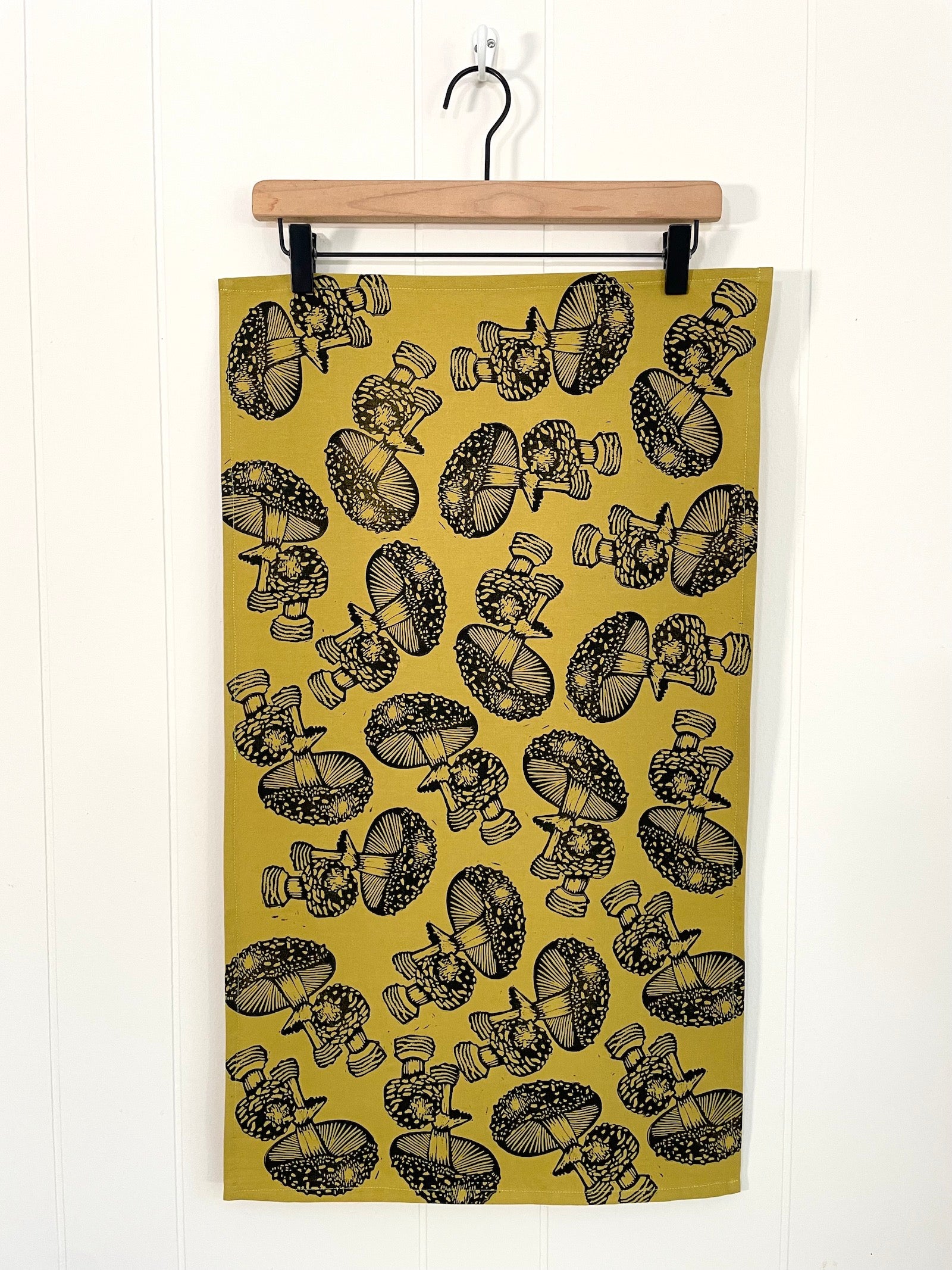 100% cotton tea towel printed with a fly agaric mushroom. This print has been hand drawn and carved from a linoleum block. Each image is hand printed on chartreuse colored crinkle cotton. Each tea towel has a 100% cotton hanger on a back corner. Each tea towel is 100% unique with no two exactly alike. Tea towels may be machine washed on cold cycle. We recommend line drying and using a warm iron as needed. Image may fade over time with heavy use due to the nature of the hand printing process.
