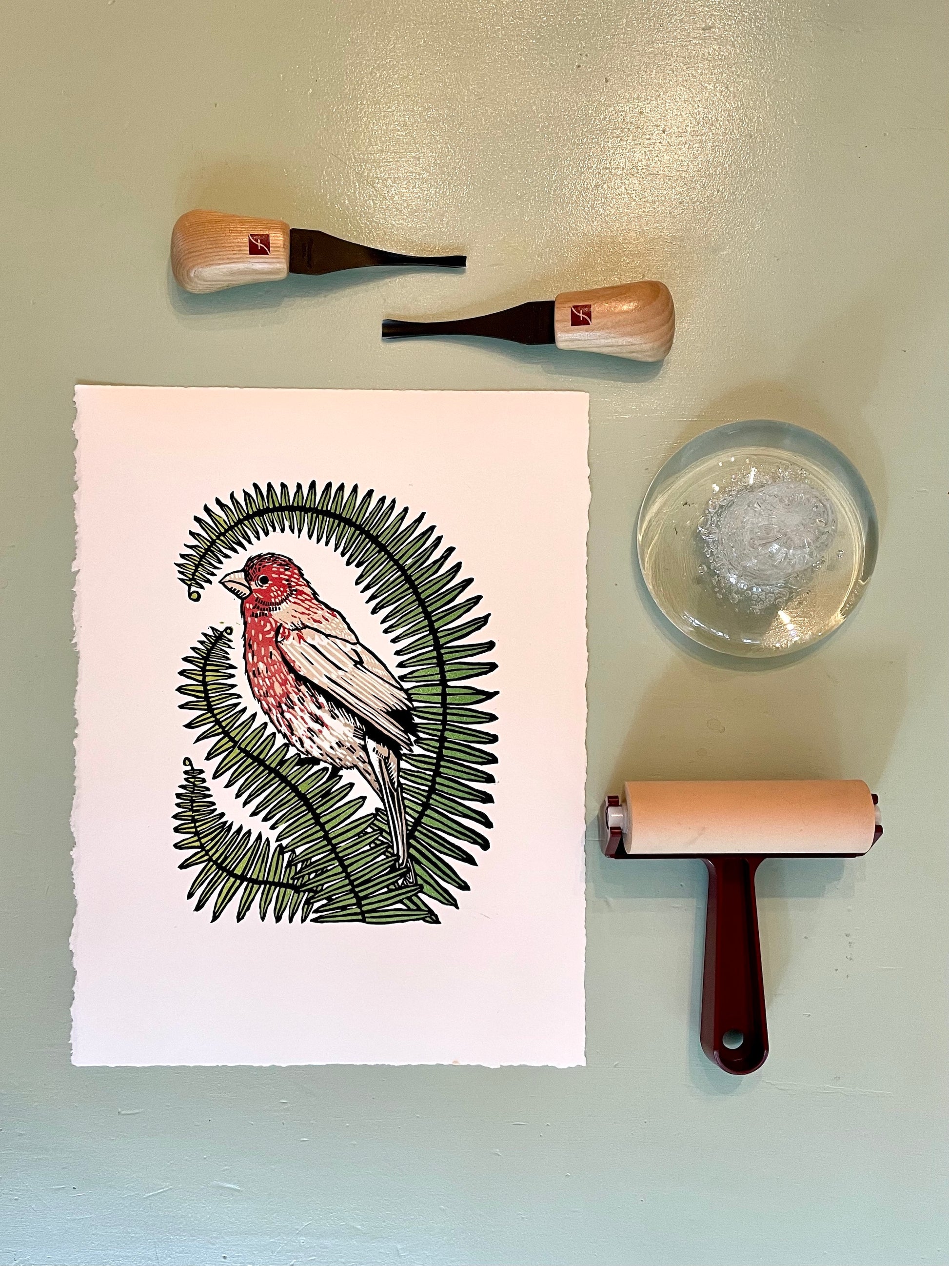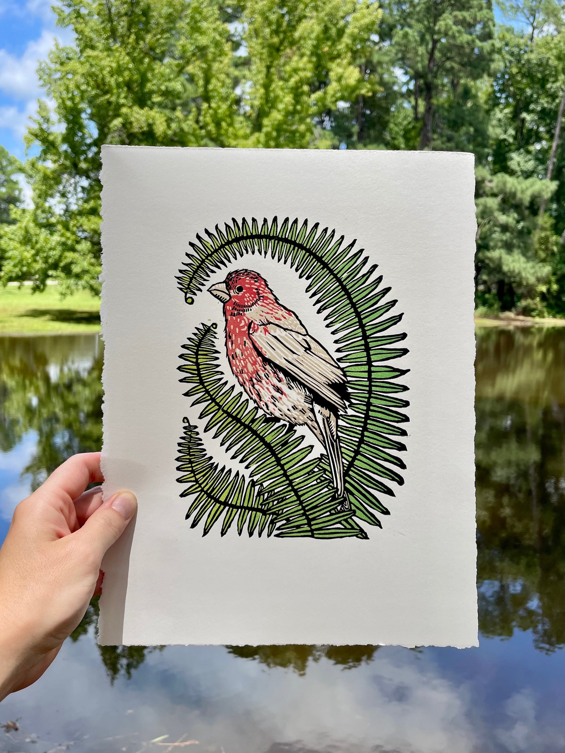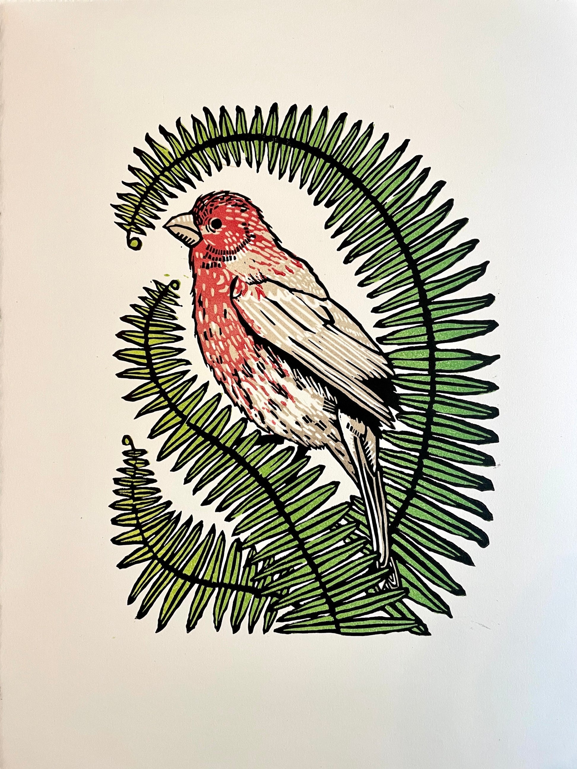 This print is a four color linoleum print that has been carved and printed by hand. Each color is a separate layer requiring its own pass through the press. It is a limited edition of 23 prints, each one slightly different due to the nature of hand printing. I created this print in honor of the house finches living in the Boston fern on my carport. It is printed with speedball Akua and professional oil based inks on heavyweight stonehenge paper. Packaged in a clear plastic sleeve. Signed and numbered. 9" x 12"