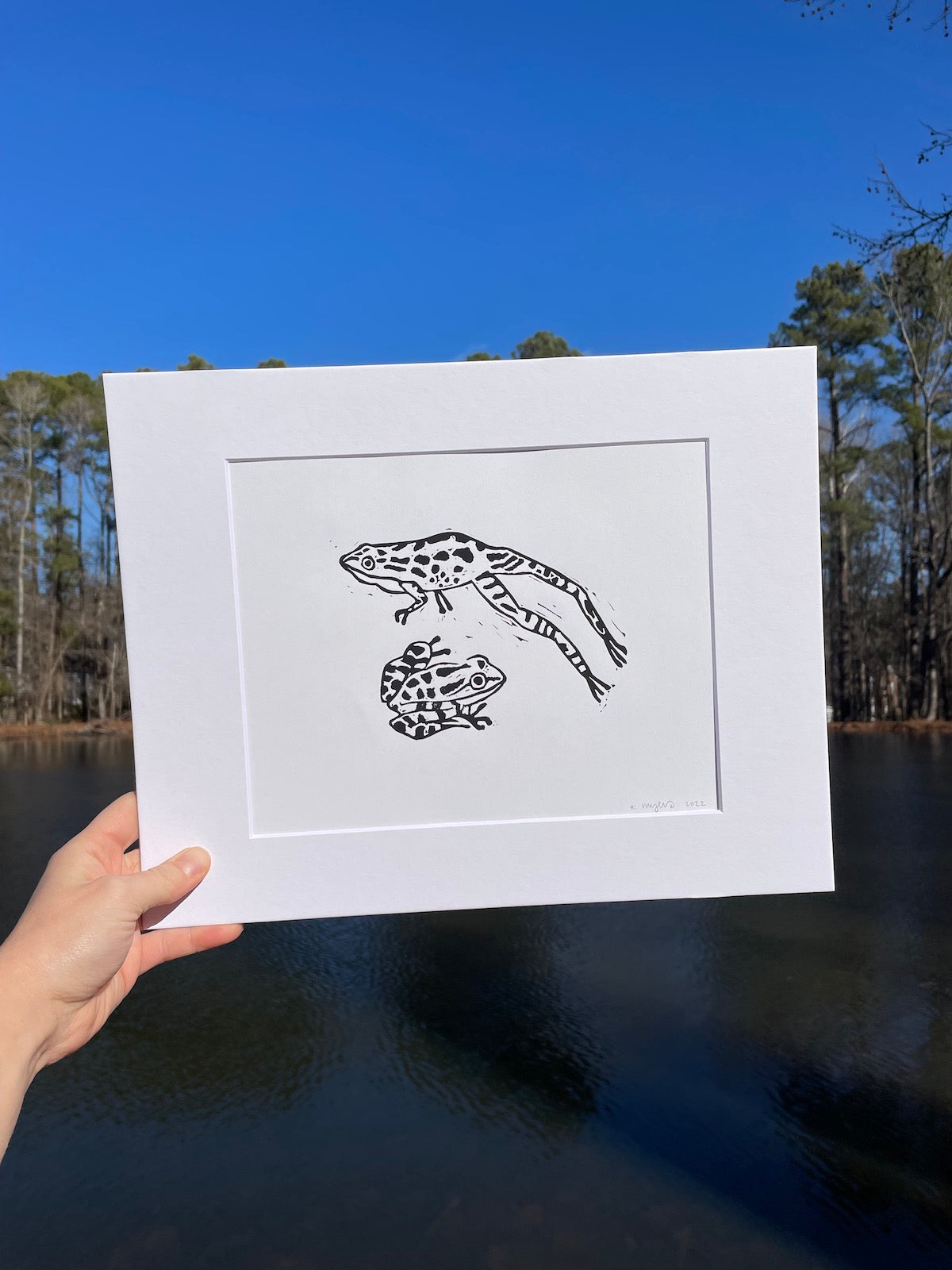 Linoleum Block Print of jumping pickerel frogs. Hand printed in black ink on white paper with white mat. Mat measures 11" x 14"