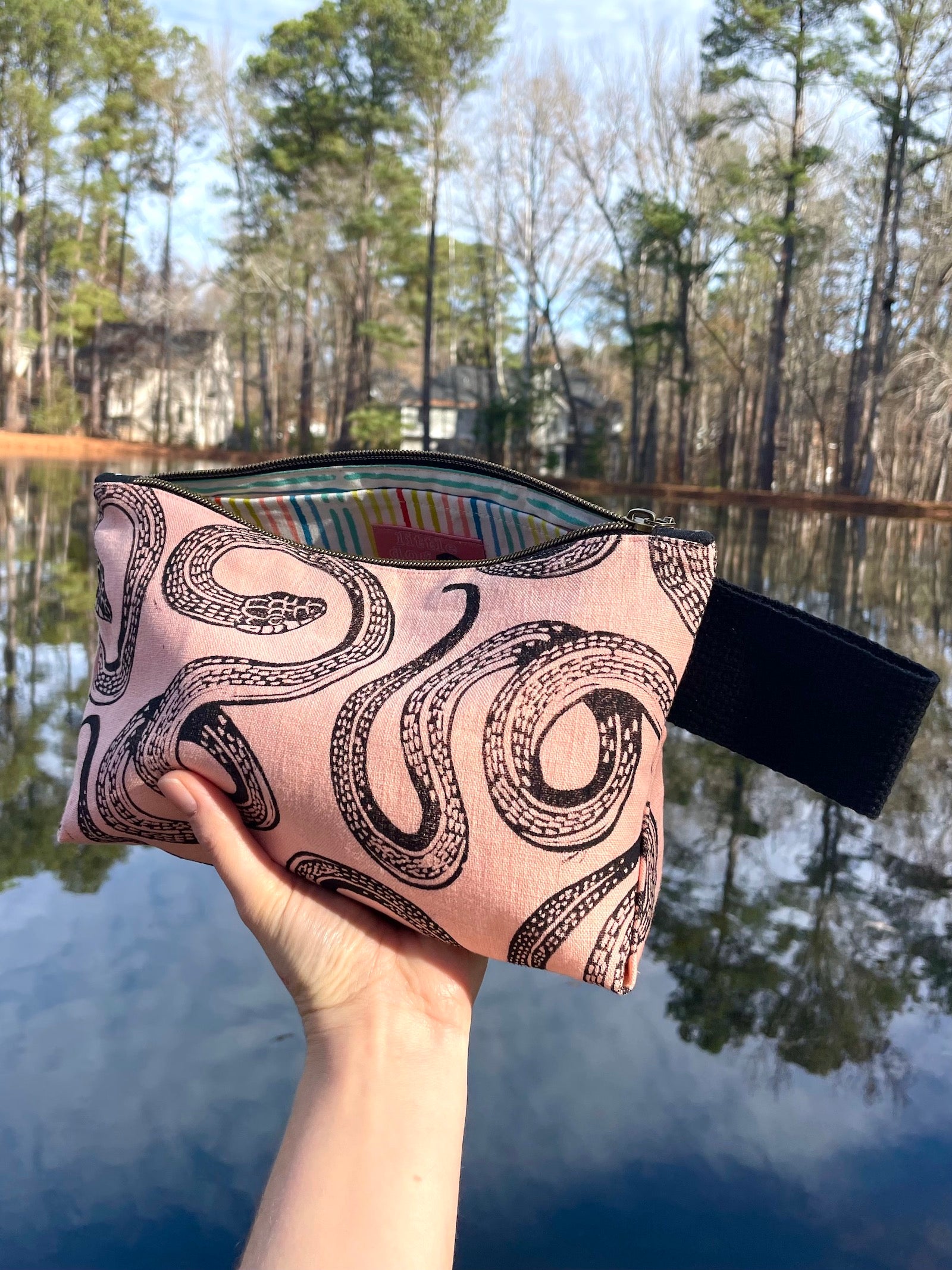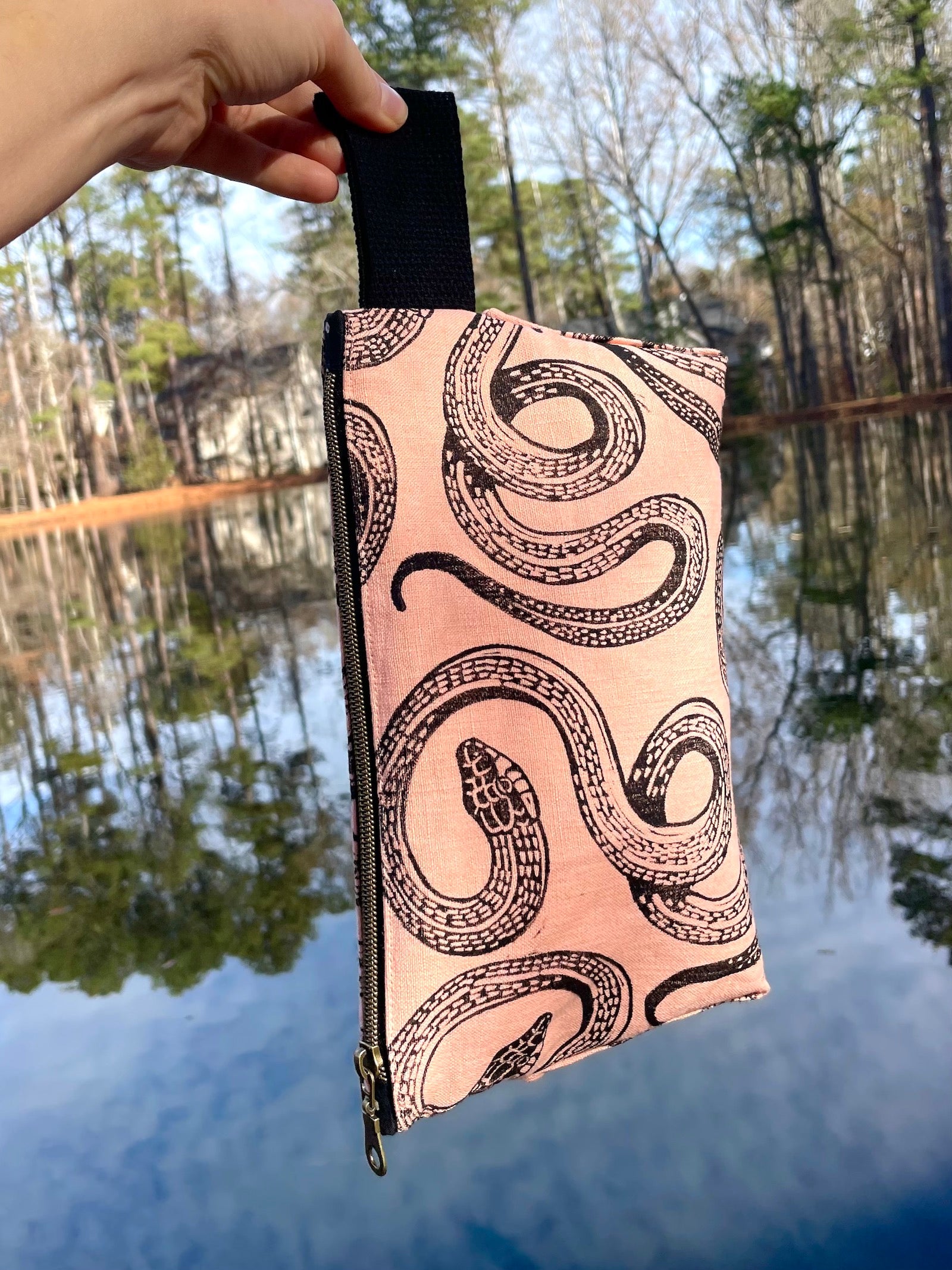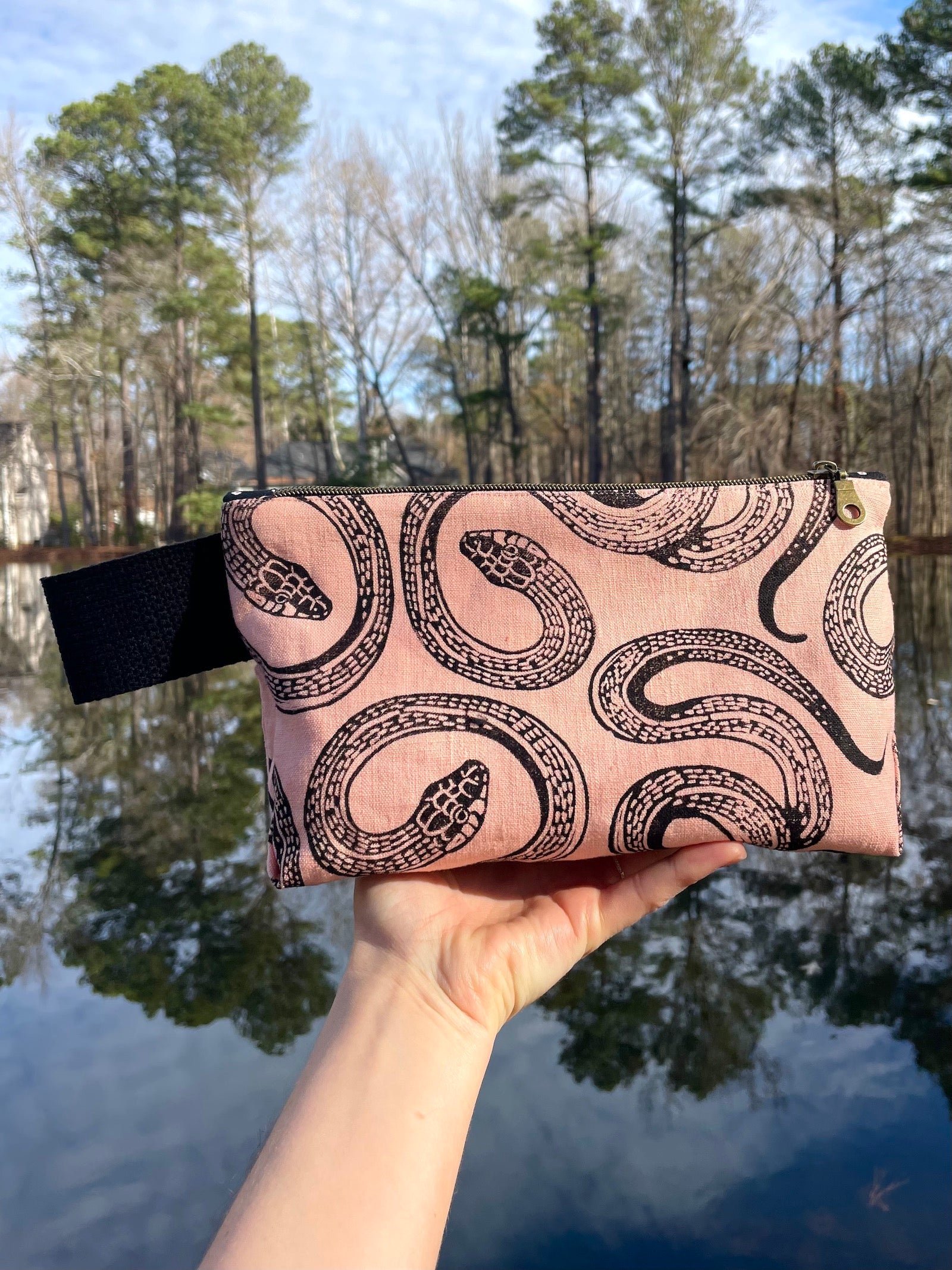 Large triangular zipper pouch printed with a hand carved linoleum block print of a garter snake. 100% linen outer with 100% cotton lining, polyester brass colored zipper and wide cotton webbing handle. Store you toiletries, makeup, power cords, pencils, art supplies, jewelry, etc.