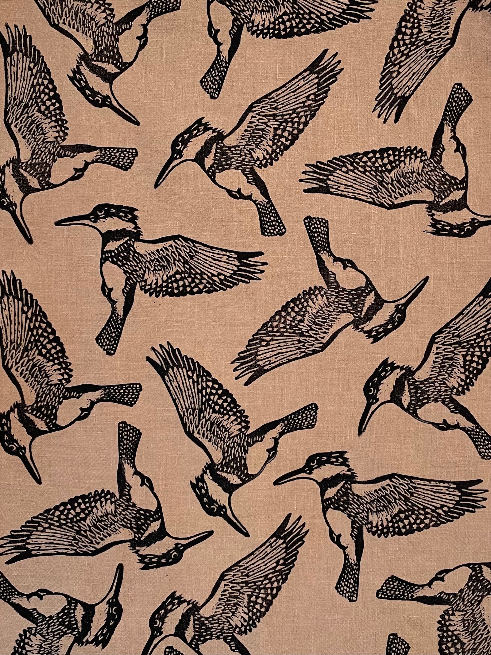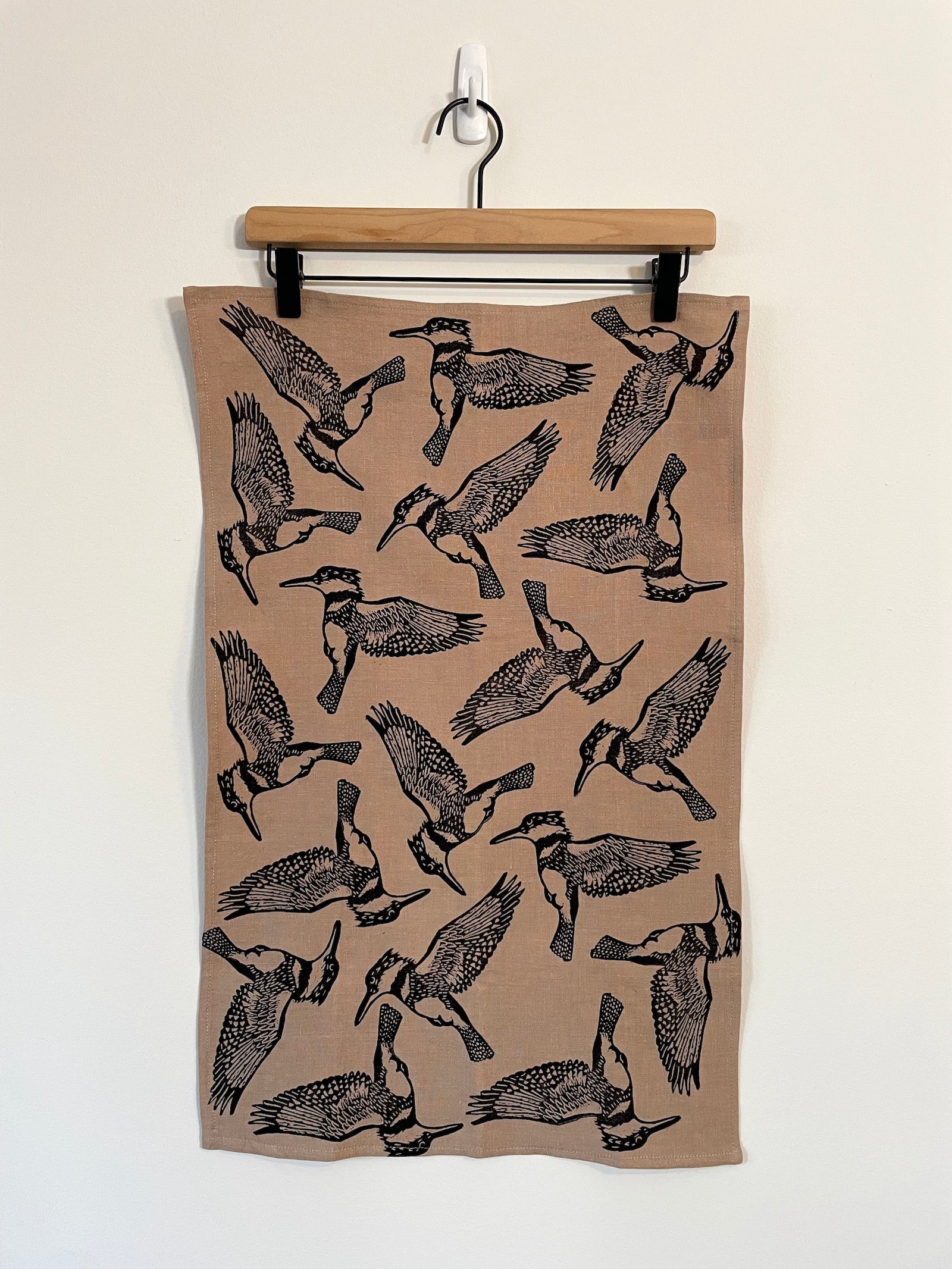 100% linen tea towel printed with a belted kingfisher. This print has been hand drawn and carved from a linoleum block. Each image is hand printed on coffee colored soft washed linen. Each tea towel has a 100% cotton hanger on a back corner. Each tea towel is 100% unique with no two exactly alike. Tea towels may be machine washed on cold cycle. We recommend line drying and using a warm iron as needed. Image may fade over time with heavy use due to the nature of the hand printing process.