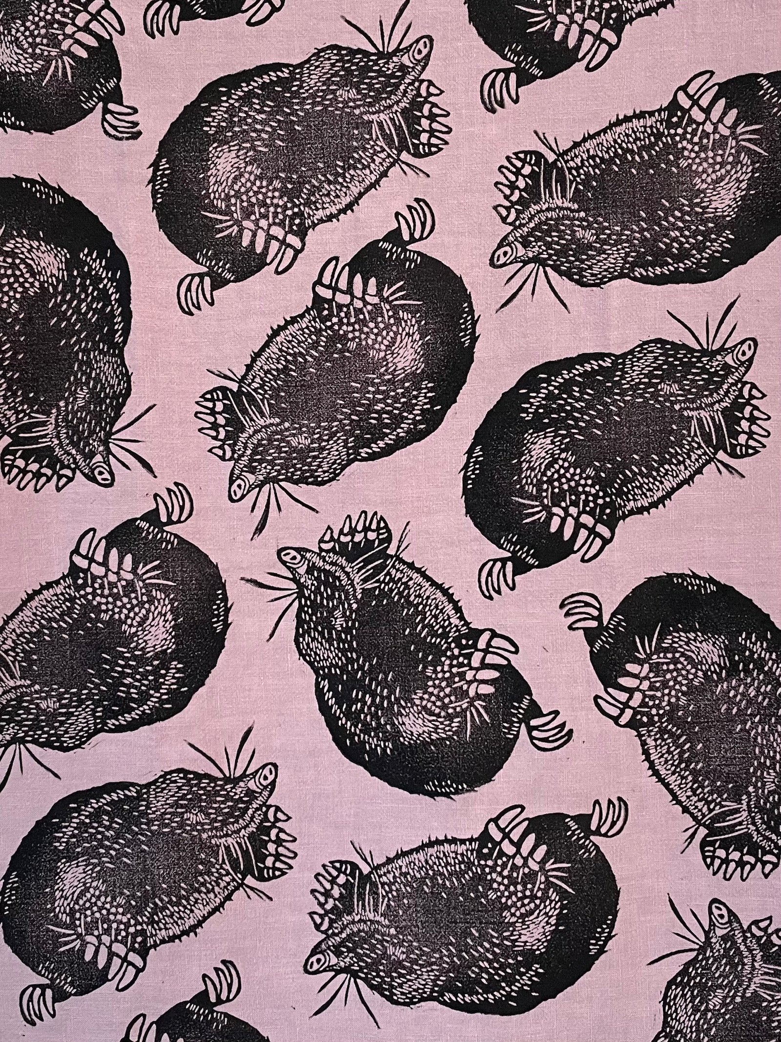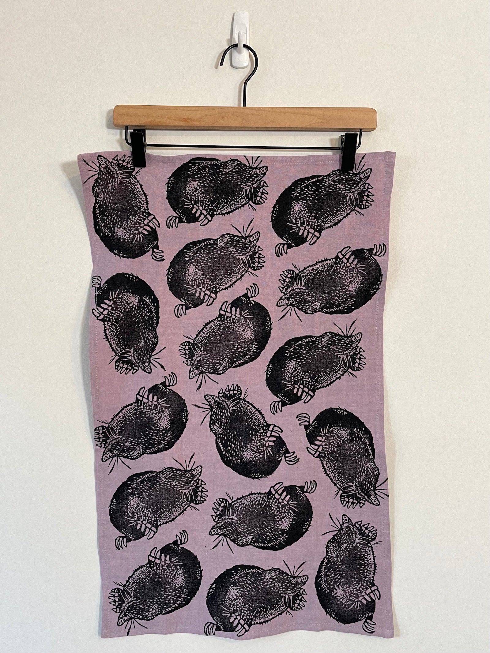 100% linen tea towel printed with an eastern mole. This print has been hand drawn and carved from a linoleum block. Each image is hand printed on lilac colored soft washed linen. Each tea towel has a 100% cotton hanger on a back corner. Each tea towel is 100% unique with no two exactly alike. Tea towels may be machine washed on cold cycle. We recommend line drying and using a warm iron as needed. Image may fade over time with heavy use due to the nature of the hand printing process.