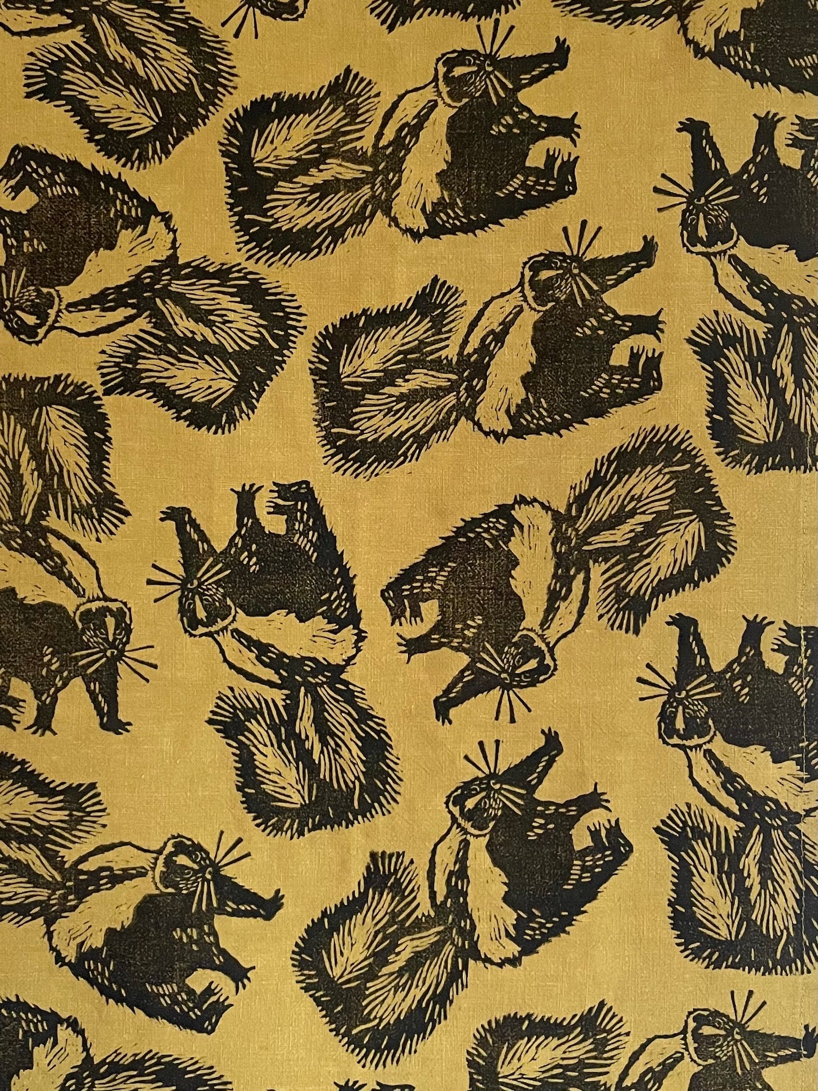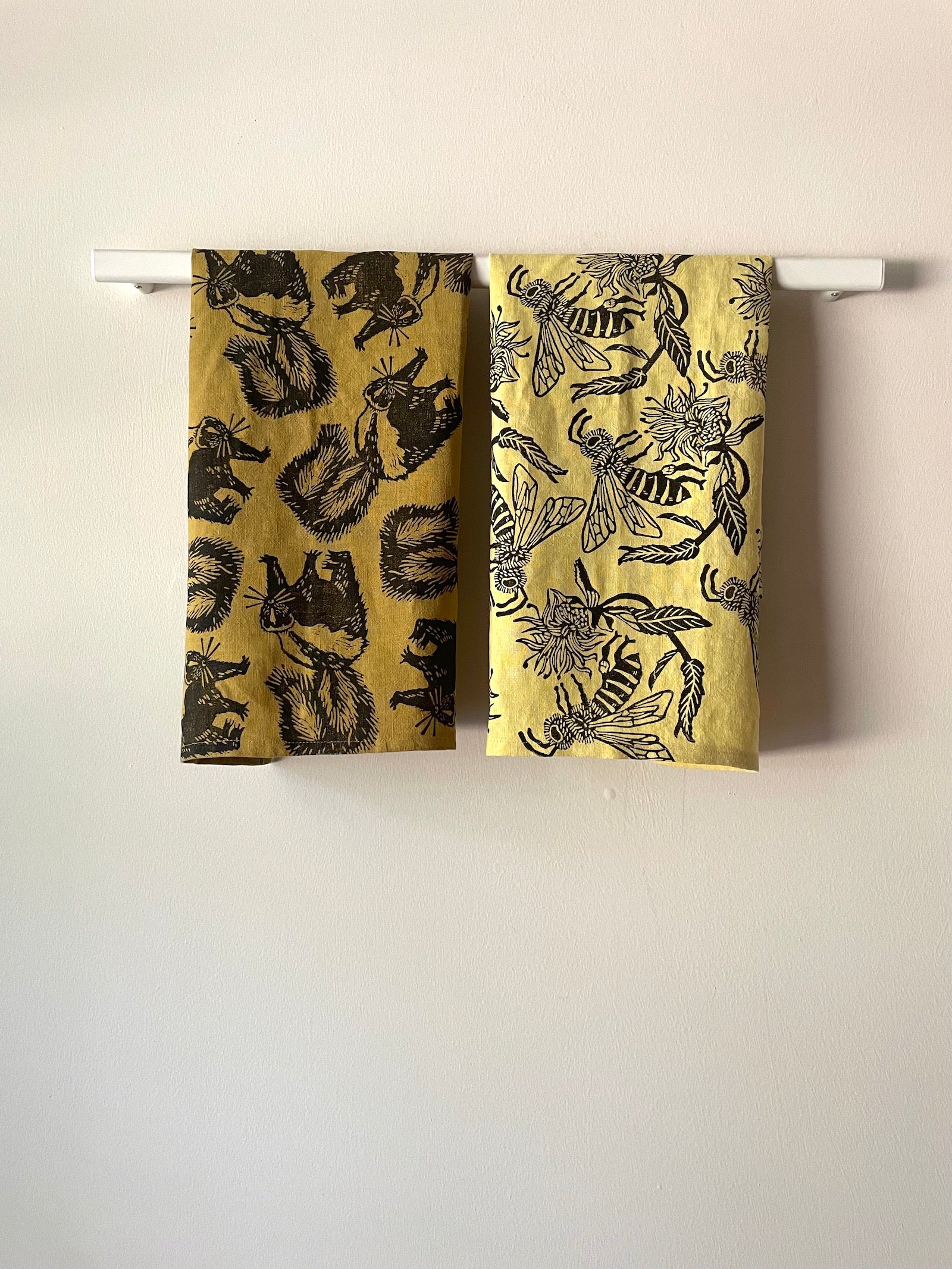 100% linen tea towel printed with a striped skunk. This print has been hand drawn and carved from a linoleum block. Each image is hand printed on citron colored soft washed linen. Each tea towel has a 100% cotton hanger on a back corner. Each tea towel is 100% unique with no two exactly alike. Tea towels may be machine washed on cold cycle. We recommend line drying and using a warm iron as needed. Image may fade over time with heavy use due to the nature of the hand printing process.
