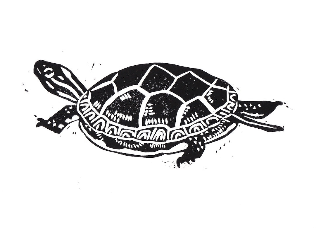 Linoleum Block Print of a painted turtle. Printed in black ink on heavyweight printmaking paper. 5" x 7" print in 8" x 10" white mat. Signed and numbered.