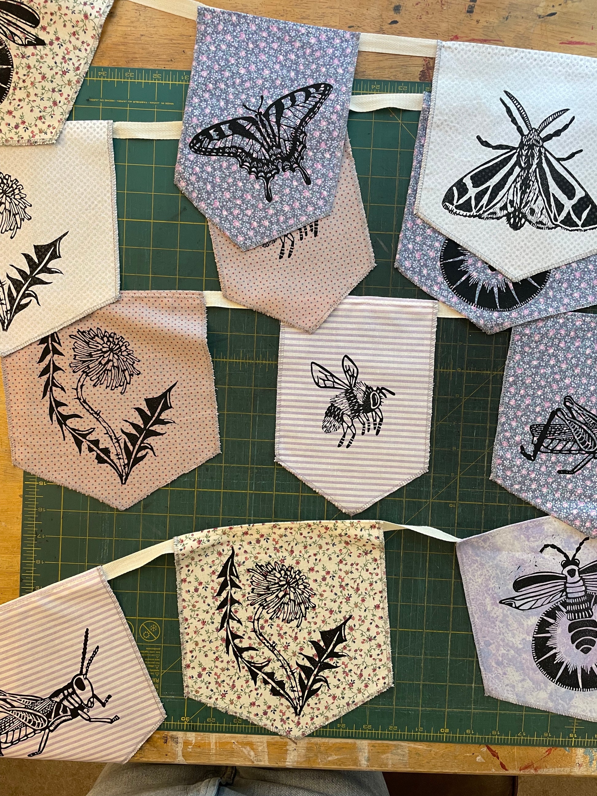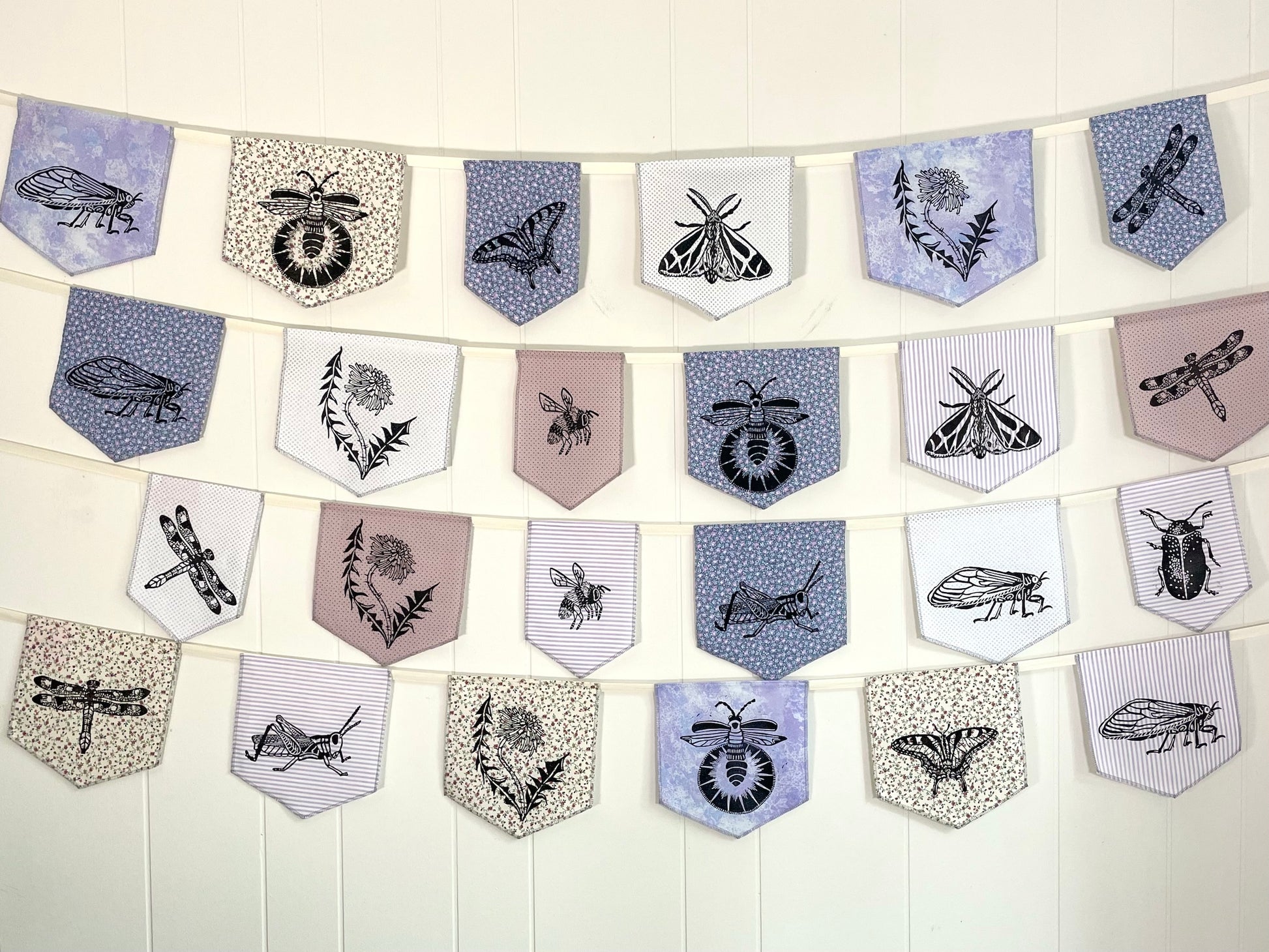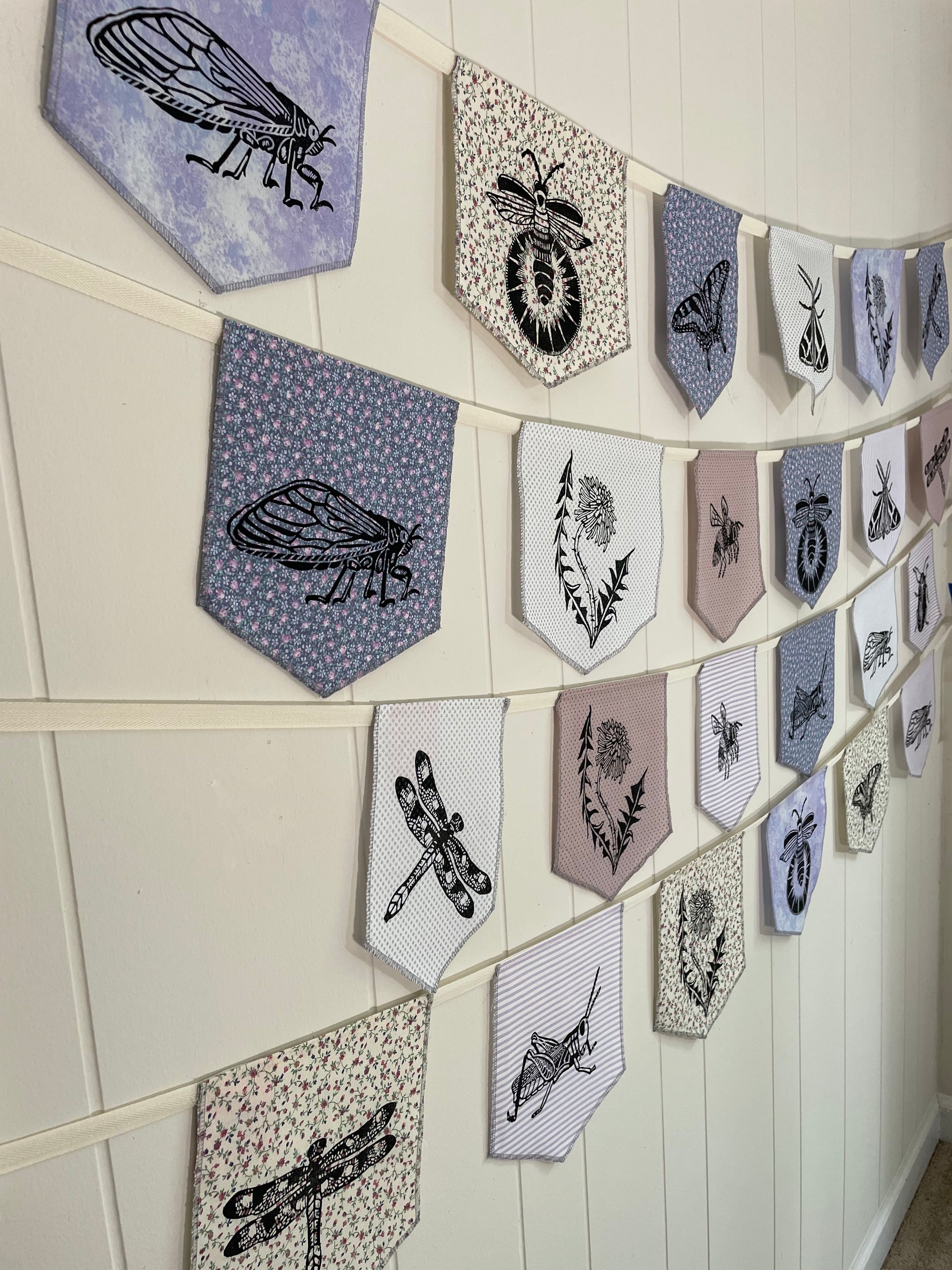 Add some quirky decoration to your home this season. These fabric garlands are hand printed with local animals on 100% cotton fabric. Each print has been hand carved in a linoleum block. Animals on your garland may include: Cicada, Eastern Firefly, Eastern Tiger Swallowtail Butterfly, Harnessed Tiger Moth, Dandelion, 12 Spotted Skimmer, Spur-throated Grasshopper, Yellow Banded Bumble Bee, or Dogbane Beetle. Fabrics are coordinating selection of vintage purple and white patterned fabrics. Each Garland includes 6 flags and is approximately 2.5 yards long. Twill tape has loops for hanging on each end.