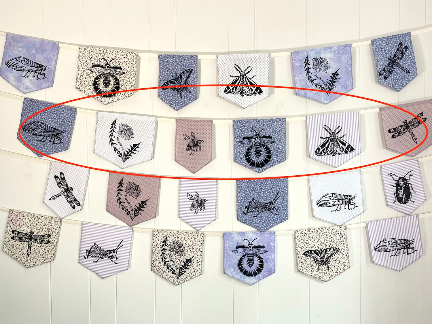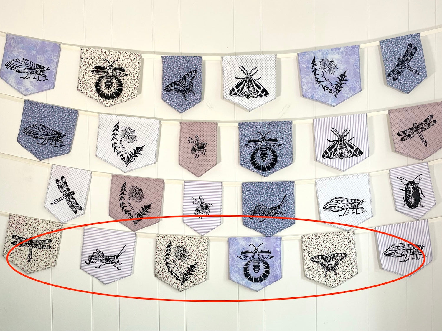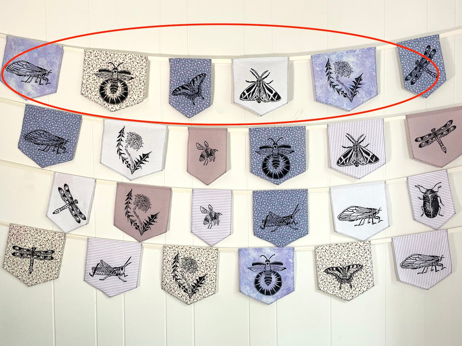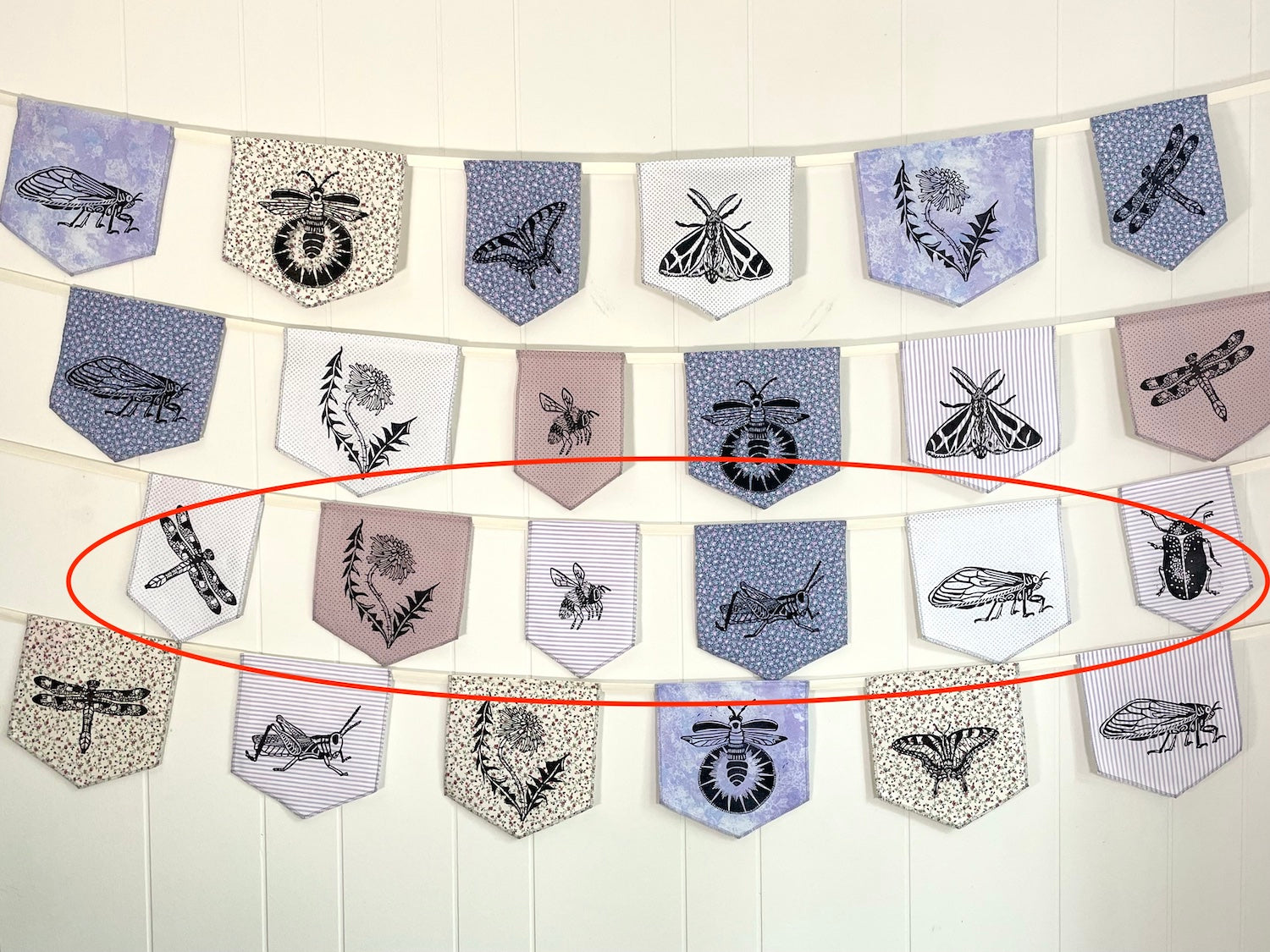 Add some quirky decoration to your home this season. These fabric garlands are hand printed with local animals on 100% cotton fabric. Each print has been hand carved in a linoleum block. Animals on your garland may include: Cicada, Eastern Firefly, Eastern Tiger Swallowtail Butterfly, Harnessed Tiger Moth, Dandelion, 12 Spotted Skimmer, Spur-throated Grasshopper, Yellow Banded Bumble Bee, or Dogbane Beetle. Fabrics are coordinating selection of vintage purple and white patterned fabrics. Each Garland includes 6 flags and is approximately 2.5 yards long. Twill tape has loops for hanging on each end.