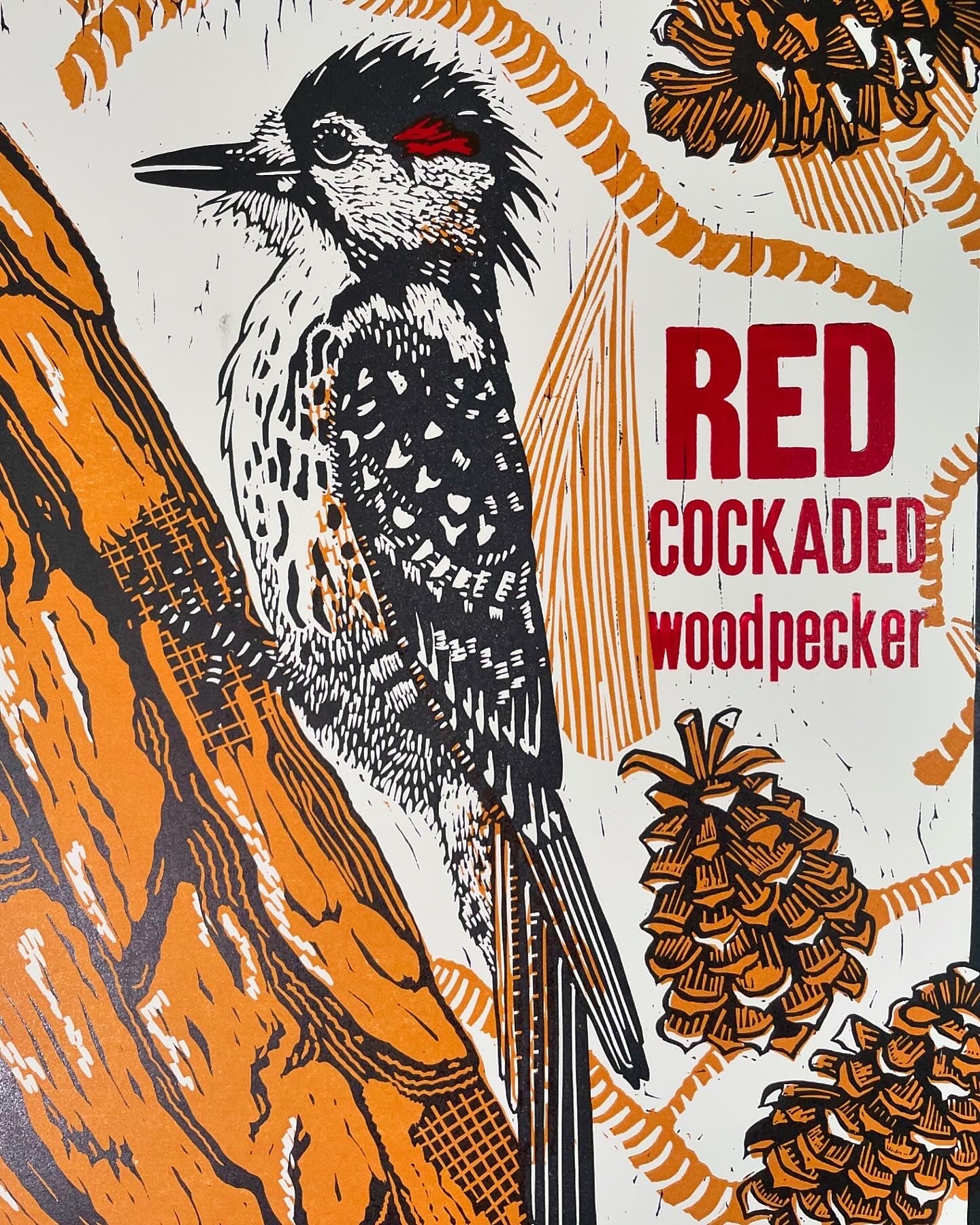 Three color letterpress poster featuring a Red-Cockaded Woodpecker and Longleaf Pine Tree.