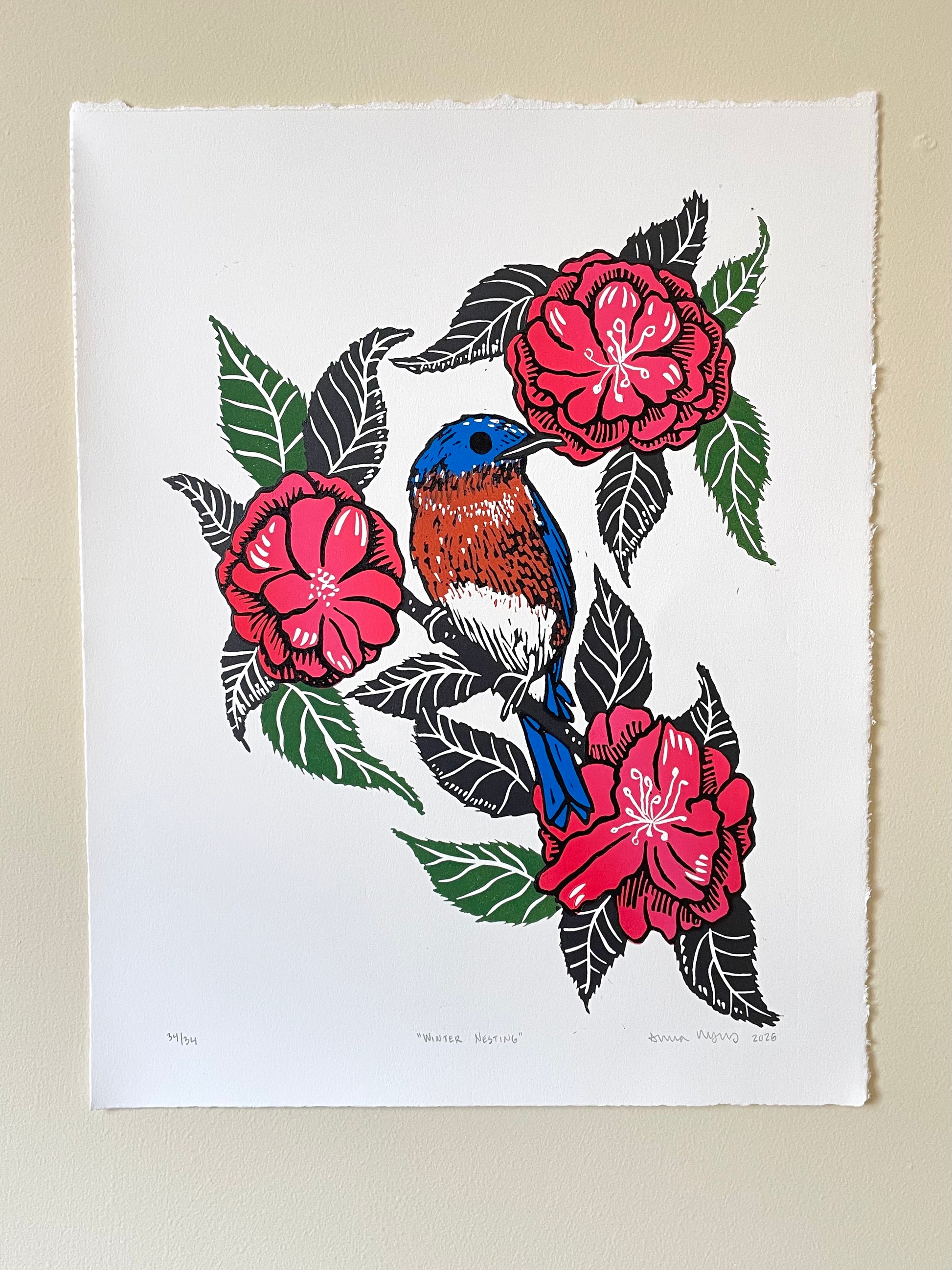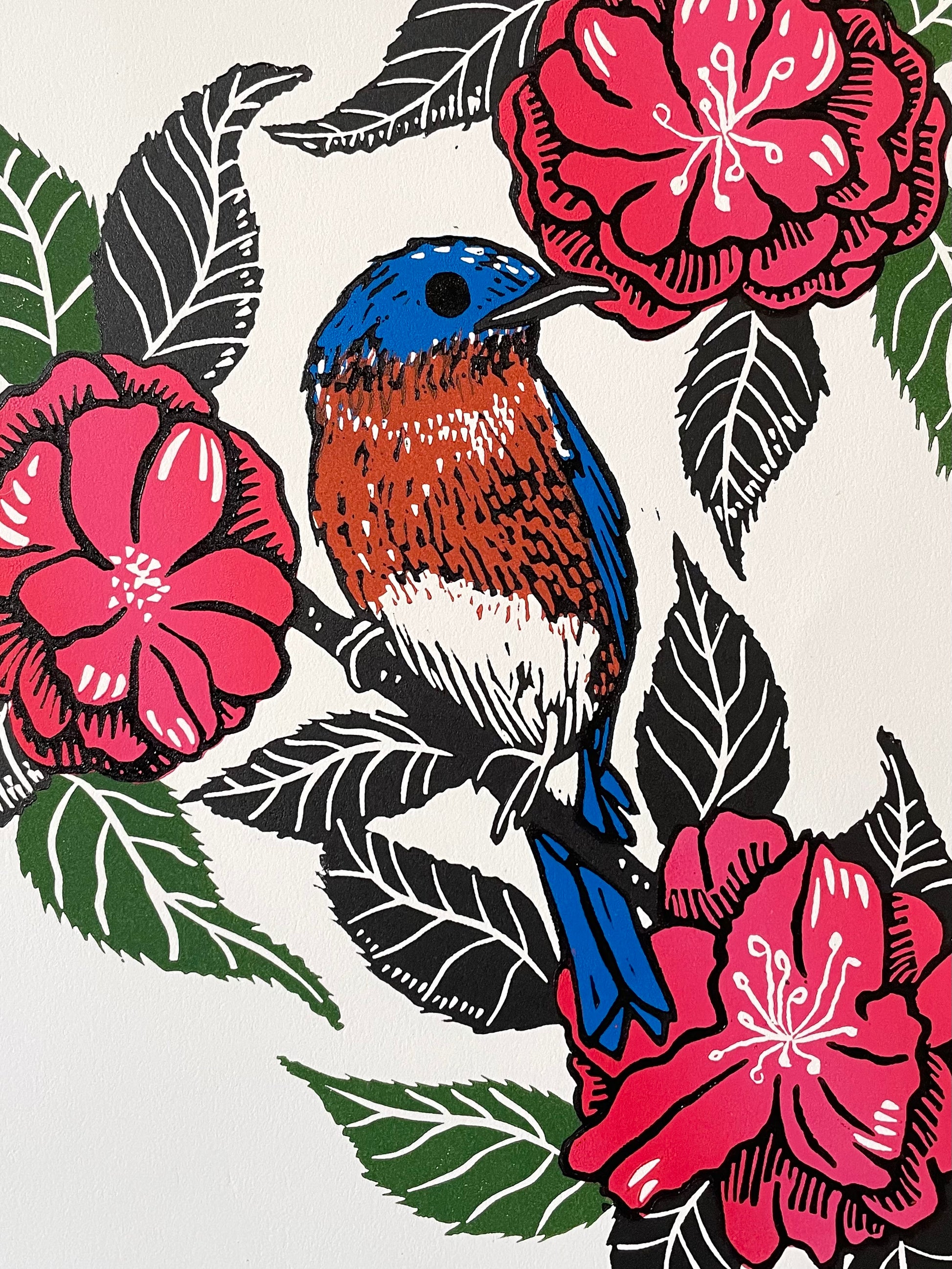 Linoleum relief print of an Eastern bluebird in a blooming common camellia: a bright moment during winter. 3 colors printed one layer at a time. Signed and numbered. 11" x 14." Fits standard frame.