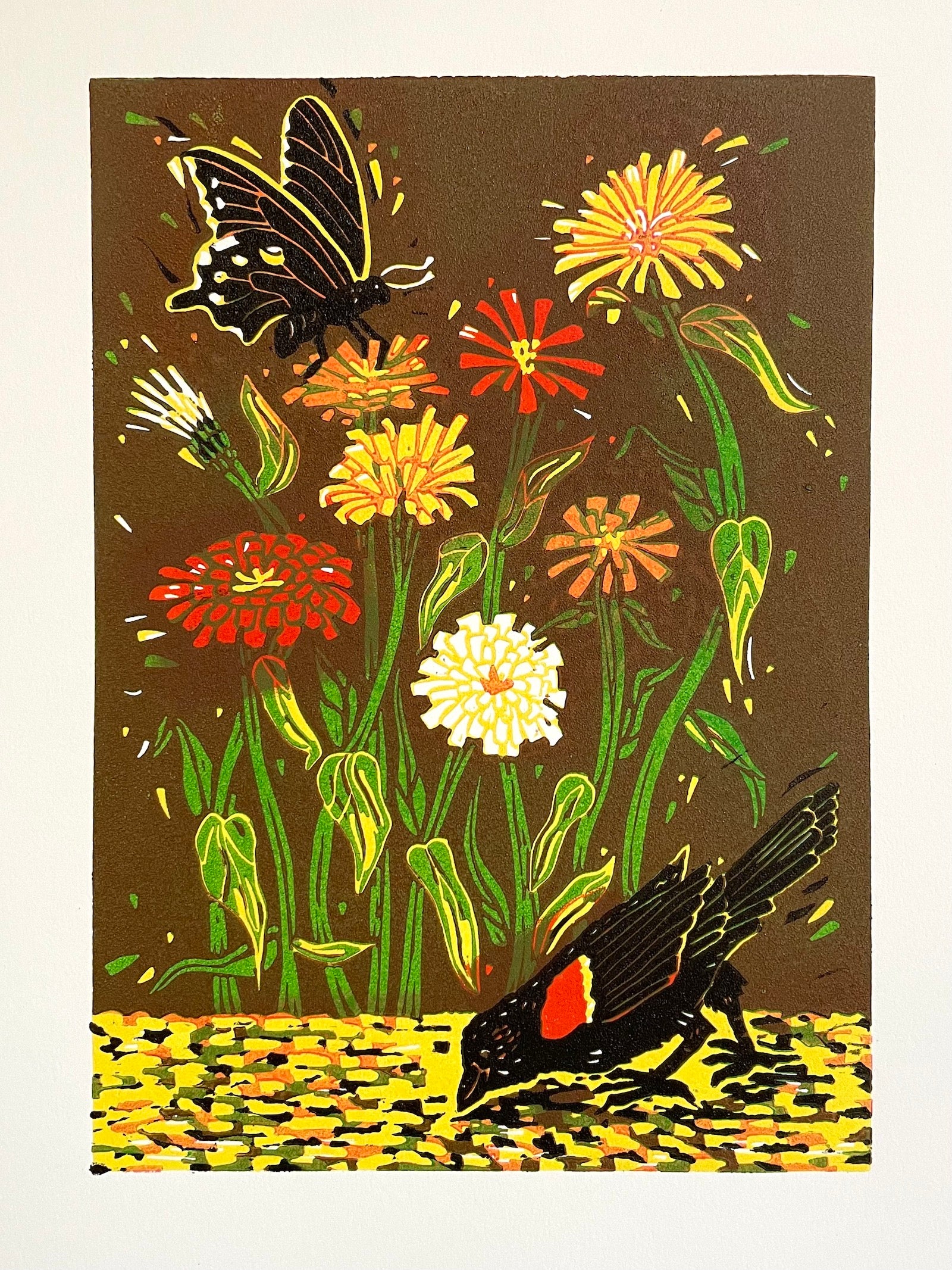 Reduction print of a zinnia garden featuring a red-winged blackbird and a California pipevine swallowtail. Limited edition of 16. Packaged in a clear plastic sleeve. Signed and numbered. 11" x 14." Fits standard frame.